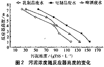 厭氧反應(yīng)器中的污泥顆;潭容^好,經(jīng)2年運(yùn)行后,從反應(yīng)器各取樣管取樣測定污泥濃度的結(jié)果見圖2。