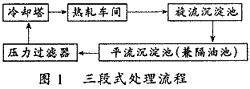 目前,國內(nèi)熱軋車間濁環(huán)水處理流程大部分為三段式,并采用機械設備除油。其流程見圖1。