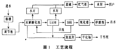 根據(jù)廢水性質(zhì),我們采用了三個處理單元去除污染物:單元采用格柵脫渣,去除廢水中粗顆粒的懸浮物,可回收作為飼料或肥料;第二單元采用脫色和水解酸化預(yù)處理,提高廢水的可生化性[2],同時沉淀去除懸浮物,通過物化作用脫色。第三單元采用厭氧、好氧、兼氧生化處理,徹底降解有機(jī)物。厭氧采用上流式厭氧流化床反應(yīng)器(UASB)[3],好氧采用間歇式活性污泥反應(yīng)池(SBR)[4],整個處理系統(tǒng)耐沖擊負(fù)荷能力強(qiáng)。