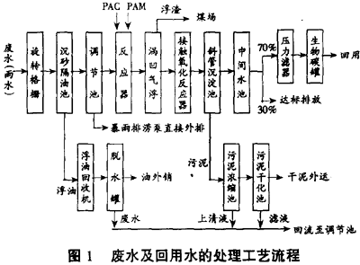 機(jī)械工廠廢水中主要污染物是油,根據(jù)油在廢水中存在形態(tài)的不同,分別采用不同的工序予以去除。廢水及回用水的處理工藝流程見(jiàn)圖1。