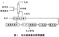 乙炔發(fā)生器產(chǎn)生的渣漿廢水進(jìn)入渣漿收集池,再用泥漿泵輸送到渣漿沉淀池,在池中進(jìn)行沉淀處理。上部清液經(jīng)溢流進(jìn)人豎流式二級沉淀池中,進(jìn)行充分沉淀,使廢水中Ca(OH)2微粒再次沉降,清液溢流入集水池,用清水泵送入乙炔發(fā)生器,與冷卻塔廢水混合后在乙炔發(fā)生器內(nèi)與電石進(jìn)行反應(yīng),使高PH、高S2-、CODcr廢水得以閉路循環(huán)使用。