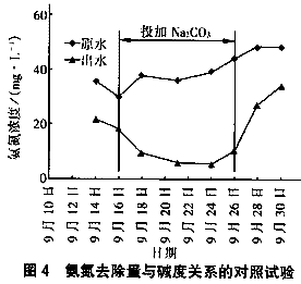 按照生活污水中有40mg/L氨氮被氧化成NO3-(堿度/氨氮=8.85)來計算,好氧反應(yīng)區(qū)內(nèi)硝化反應(yīng)正常進(jìn)行需要堿度為354 mg/L(以CaCO3計),而進(jìn)入好氧段的污水中堿度平均為210mg/L,可見原水經(jīng)過缺氧段處理后堿度不能滿足硝化反應(yīng)的需要,理論上生活污水中需要投加144mg/L的CaCO3(相當(dāng)于153mg/L的Na2CO3)。當(dāng)回流比為200%時投加Na2CO3以滿足堿度需求的前后對照試驗見圖4。?