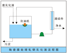 通常采用的主要處理手段是氧化氣浮破乳工藝和有機膜過濾法,氧化氣浮破乳法出水含油量高,破乳后的油不能回收,利用價值低,且達不到環(huán)保要求;有機膜處理方法設(shè)備投資大,處理成本高,運行能耗高,清洗費用大,清洗劑還造成二次污染。 公司經(jīng)過長期實驗研究,開發(fā)出陶瓷膜處理軋鋼乳化液廢水技術(shù),取得了良好的應(yīng)用效果。