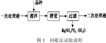 采用晶析法除磷,國內(nèi)的報(bào)道很少,所用的晶種有磷灰石、煉鋼轉(zhuǎn)爐的爐渣等。前蘇聯(lián)和日本等國家也都進(jìn)行過這方面的研究,尤以日本的研究比較為廣泛,所用的晶種有膠狀金屬氧化物、浮石、活性氧化鎂熔渣等。這些方法的晶種添加物均為非結(jié)晶母體,需特別處理才可以使用,且處理運(yùn)行費(fèi)用高,而且處理液的初始磷濃度相對(duì)較低。在該體系中,一次處理液除含有未沉淀下來的MgNH4PO4•6H2O小結(jié)晶外,還有未反應(yīng)的磷及未反應(yīng)的復(fù)合沉淀劑。我們?cè)诮梃b國內(nèi)外晶析法的作用原理和試驗(yàn)結(jié)果后,提出了以除磷化學(xué)沉淀產(chǎn)物MgNH4PO4•6H2O作為晶種去除一次處理液中磷的方法。