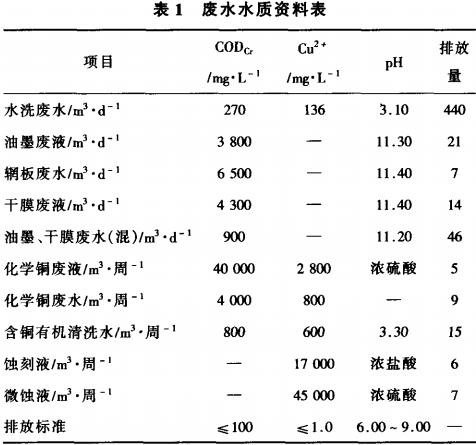 依據(jù)廠方中期規(guī)劃,廢水處理系統(tǒng)的規(guī)模為1500m3/d,工期工程為500m3/d。設(shè)計(jì)參數(shù)為:pH 3.50,Cu2+ 80mg/L,BOD5 200mg/L,COD 300mg/L,SS<200mg/L,酸化廢液22m3/d;處理后的出水達(dá)到GB8978-1996二級(jí)和廣東省廢水排放二級(jí)標(biāo)準(zhǔn)。廢水水質(zhì)見表1。