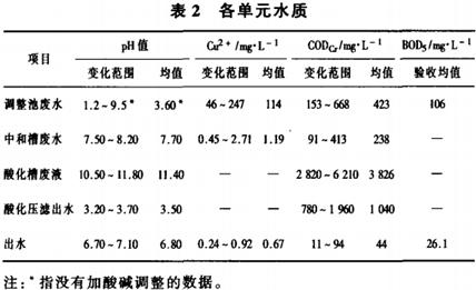 該系統(tǒng)調(diào)試運(yùn)行10個(gè)月來(lái),電化學(xué)部分運(yùn)行正常,中和槽廢水清澈透明、水質(zhì)穩(wěn)定;接觸氧化池里曝氣系統(tǒng)良好,生物掛膜量不大,產(chǎn)生的污泥較少,出水穩(wěn)定。該工程于2003年5月竣工,8月順利通過(guò)【水處理設(shè)備】驗(yàn)收,各處理單元的出水水質(zhì)見表2。