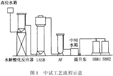 由于廢水濃度很高,且可生化性較好,因此采用厭氧-好氧處理工藝。廢水首先進(jìn)入水解酸化器,在此進(jìn)一步提高可生化性,同時(shí)又去除大部分懸浮物;水解酸化段的出水進(jìn)入U(xiǎn)AS【水處理技術(shù)】B反應(yīng)器;經(jīng)UASB反應(yīng)器處理后的廢水(懸浮物含量較低),進(jìn)入AF工藝;由于廢水中氨氮濃度較高,好氧處理采用了具有較強(qiáng)脫氮能力的SBR工藝。中試工藝流程見圖1。