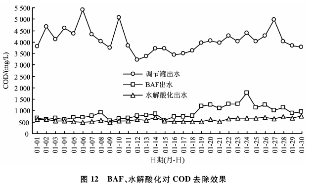 曝氣生物濾池抗沖擊負(fù)荷能力強(qiáng),進(jìn)水 COD為3000~5500mg/L波動(dòng)條件下,出水 COD趨于平穩(wěn);曝氣生物濾池大幅削減廢水有機(jī)污染物,對(duì)COD去除率高達(dá) 77.8%;水解酸化雖然對(duì) COD的去除率較低,但其實(shí)現(xiàn)“水質(zhì)穩(wěn)定器”作用,使出水COD平穩(wěn)。