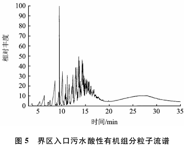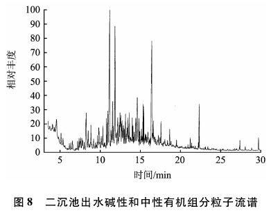 生化二沉出水酸性及堿性、中性萃取物的 GC/MS分析結(jié)果見(jiàn)圖 7和圖 8。