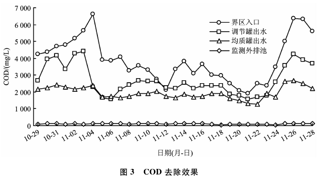 由圖 12可知,升級(jí)改造后調(diào)節(jié)罐出水 COD平均值為 4073.5mg/L,比較大值為 5395.0mg/L;經(jīng)曝氣生物濾池好氧氧化后出水 COD平均值為 902.5mg/L,比較 大 值 為 1790.0 mg/L,COD 去 除 率 為77.8%;經(jīng)水解酸化后出水 COD平均值為 598.0mg/L,比較大值為765.0mg/L,COD去除率為33.7%。
