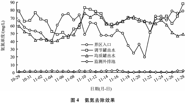 污水處理廠界區(qū)入口處氨氮的平均濃度為56.33mg/L,比較大值為 79.00mg/L;經(jīng)隔油處理、均質(zhì)調(diào)節(jié)后,氨氮的平均濃度為57.8mg/L,比較大值為76.00mg/L;經(jīng) A2O生化池 +MBR+臭氧氧化后,氨氮的平均濃度為1.42mg/L,比較大值為2.00mg/L。