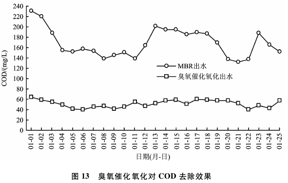由圖 13可知,升級(jí)改造后 MBR出水 COD平均值為165.6mg/L,比較大值為231.0mg/L;經(jīng)臭氧催化氧化后出水 COD平均值為 50.6mg/L,比較大值為64.0mg/L,COD去除效率為 69.4%。原設(shè)計(jì)的臭氧氧化塔,裝填催化劑形成臭氧催化氧化后,在相同塔容、水力停留時(shí)間條件下,臭氧對(duì)污水中有機(jī)物的氧化效率更高并能保證出水 COD平穩(wěn)。