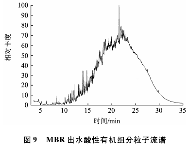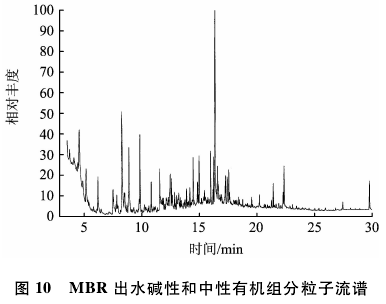 MBR出水酸性及堿性、中性萃取物的 GC/MS分析結(jié)果見(jiàn)圖9和圖10。由圖9和圖10可知,其主要污染物為環(huán)烷酸、茚酮類(lèi)、環(huán)烯(烷)烴、含氮雜環(huán)化合物及鄰苯二甲酸酯類(lèi)。