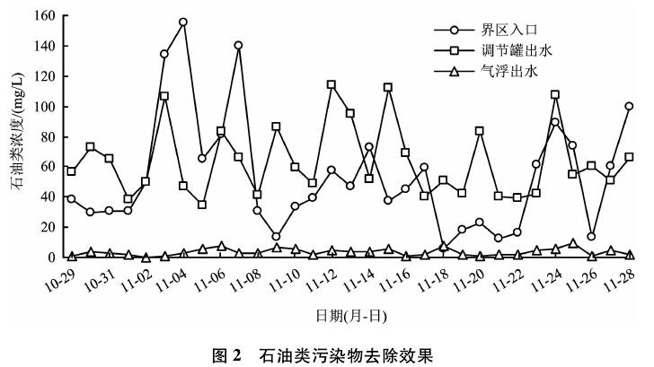污水處理廠界區(qū)入口處石油類(lèi)污染物的平均濃度為 53.74mg/L,比較大值為 155.00mg/L;經(jīng)調(diào)節(jié)罐隔油處理后,石油類(lèi)污染物的平均濃度為 63.77mg/L,比較大值為 114.00mg/L;經(jīng)斜板隔油—兩級(jí)氣浮后,出水石油類(lèi)污染物的平均濃度為 3.57mg/L,比較大值為 9.36mg/L。各處理單元石油類(lèi)污染物監(jiān)測(cè)指標(biāo)見(jiàn)圖 2。由圖 2可知,石油類(lèi)污染物可達(dá)標(biāo)排放。