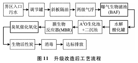 根據(jù)文獻(xiàn)資料并結(jié)合項(xiàng)目現(xiàn)場(chǎng)開(kāi)展的中試試驗(yàn)結(jié)果,確定本次升級(jí)改造工藝:界區(qū)入口污水經(jīng)原有調(diào)節(jié)罐調(diào)節(jié),而后依次經(jīng)斜板隔油、兩級(jí)氣浮去除石油類(lèi);氣浮出水經(jīng)泵提升至新增的 BAF,其出水經(jīng)泵提升至升流式水解酸化罐(原均質(zhì)罐改造);水解酸化出水依次經(jīng)原有 A2O生化池、二沉池及 MBR;MBR出水經(jīng)泵提升至臭氧催化氧化塔(原臭氧氧化塔改造),其出水依次經(jīng)生物活性炭、消毒后達(dá)標(biāo)排放。升級(jí)改造后流程見(jiàn)圖 11。