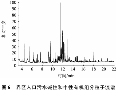 界區(qū)入口污水酸性及堿性、中性萃取物的 GC/MS分析結(jié)果見(jiàn)圖 5和圖 6。由圖 5和圖 6可知,其主要污染物為環(huán)烷酸、低級(jí)脂肪酸、含氮雜環(huán)化合物及苯酚類(lèi)化合物。