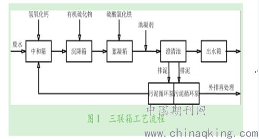三聯(lián)箱技術作為國內(nèi)的脫硫廢水處理應用比較多的一種工藝技術,包含“絮凝—沉淀—中和”,具體工藝流程如圖1所示。脫硫廢水經(jīng)加堿(氫氧化鈉或氫氧化鈣)中和后,再加入有機硫、硫酸氯化鐵等絮凝劑以及助凝劑等藥品將脫硫廢水中的懸浮物及重金屬沉淀去除。沉淀的污泥經(jīng)脫水處理后運至渣場進行綜合處理,處理出水則經(jīng)pH調(diào)節(jié)后進行排放。三聯(lián)箱技術是國內(nèi)普遍采用的脫硫廢水處理工藝,廢水含固量大成為制約該工藝發(fā)展的重要因素,不僅導致設備故障率高,運行穩(wěn)定性差,而且需要添加大量藥劑,增加運行成本。