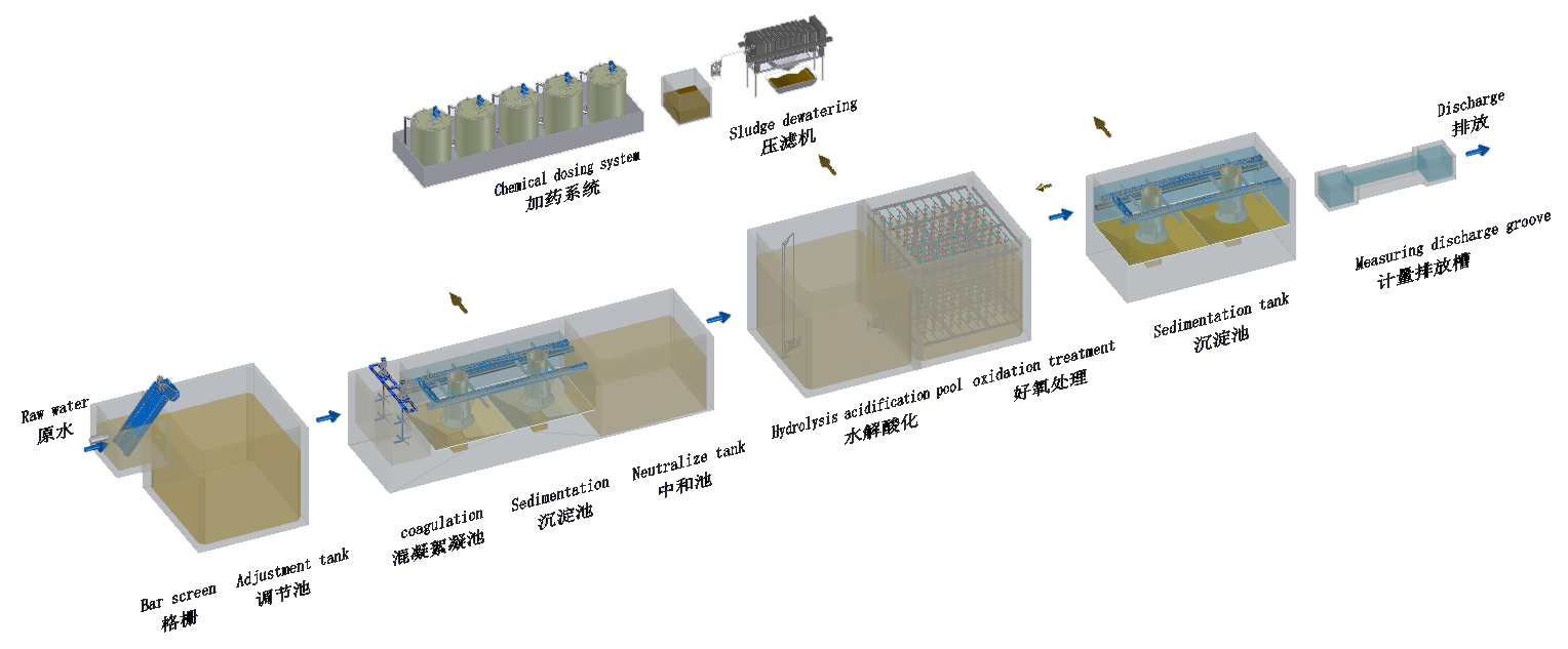 廢水從車間排放先經(jīng)過格柵去除大顆粒懸浮物質(zhì)后進(jìn)入調(diào)節(jié)池,調(diào)節(jié)水質(zhì)水量,然后由提升泵打入混凝池,通過投加藥劑進(jìn)行混凝反應(yīng),然后進(jìn)入絮凝池,投加絮凝劑進(jìn)行絮凝反應(yīng),后進(jìn)入斜板沉淀池進(jìn)行固液分離,上清液進(jìn)入中間水池,然后進(jìn)入水解酸化和好氧生物處理,后進(jìn)入二沉池進(jìn)行固液分離,上清液進(jìn)入排放水池,然后經(jīng)計(jì)量排放槽計(jì)量排放。