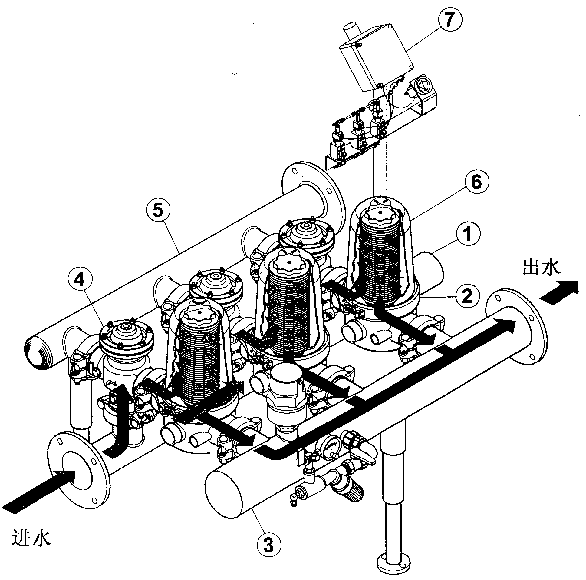 反沖洗循環(huán)由控制器(7)上的壓差數(shù)據(jù)控制,并通過時間控制器的信號開啟和關(guān)閉沖洗閥(4)?刂破(7)控制沖洗過程,以使在同一時間僅有一只過濾單元處于反沖洗狀態(tài),同時其他過濾單元繼續(xù)向系統(tǒng)中提供干凈的清水。沖洗過程持續(xù)一定時間后自動停止,持續(xù)的時間可以預(yù)先在控制器上設(shè)定。